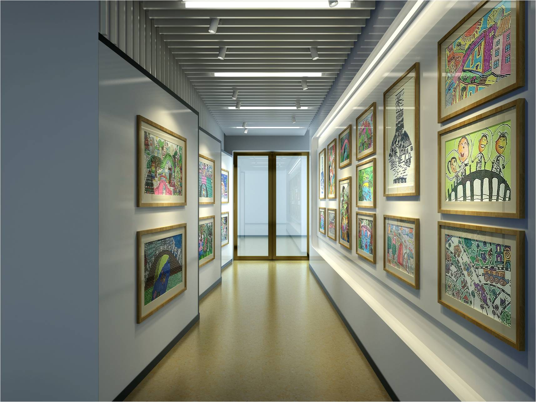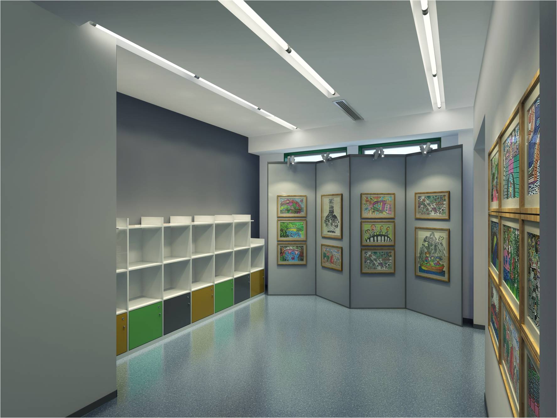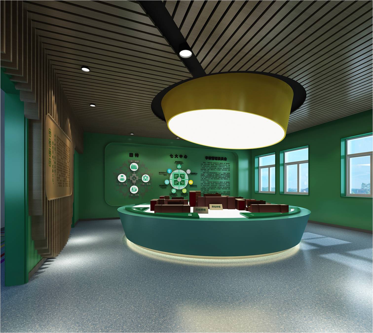 入口結(jié)合學校輔助圖形綠色墻面與翠微賦的結(jié)合及辦學特色的墻面設計直接將參觀者置于濃濃的文化氛圍中展示了教育的品牌特色。地面不同顏色的色帶將空間功能分布簡單明了的說明給參觀人員。