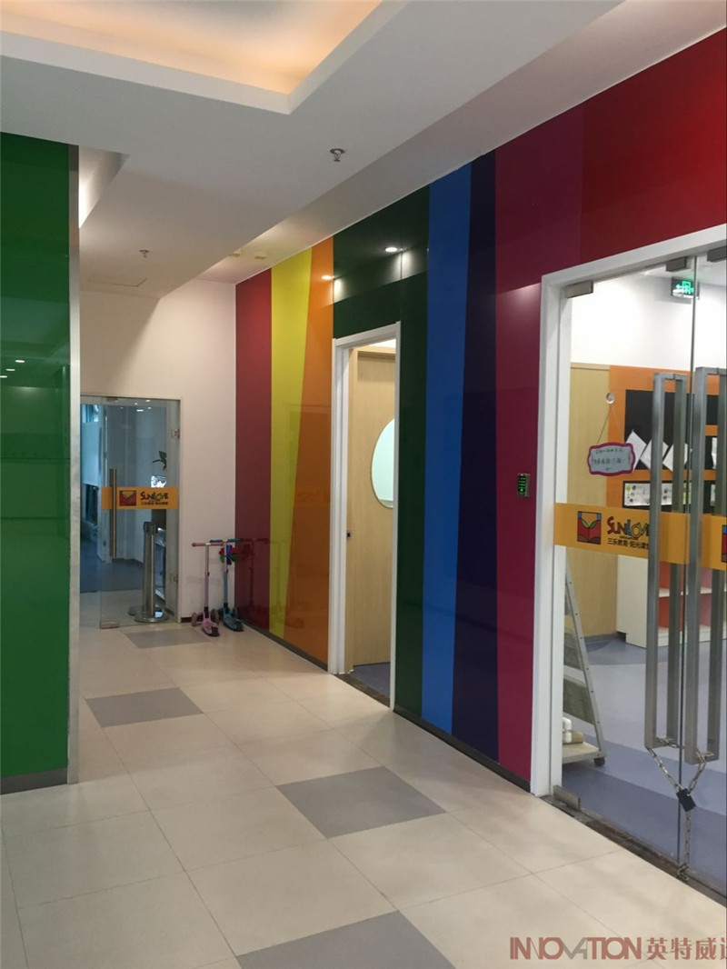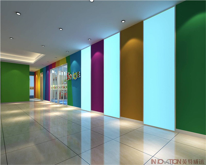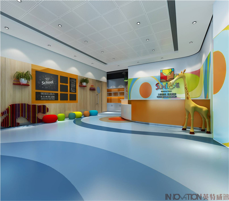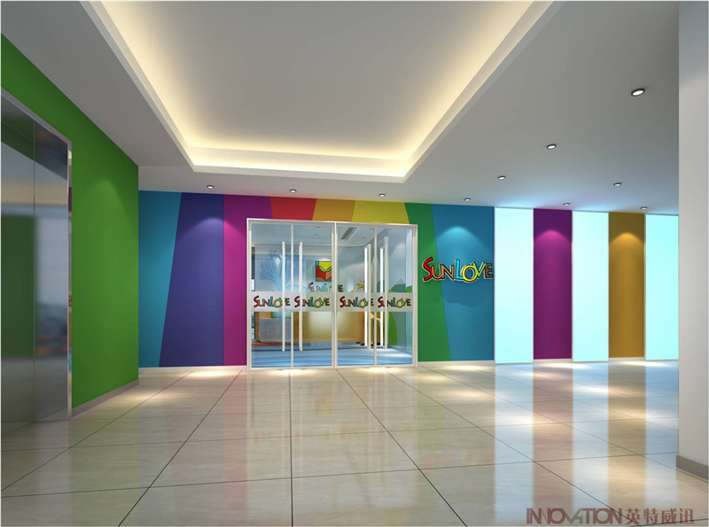 進(jìn)入大廳,首先映入眼簾的是入口門廳和logo墻,設(shè)計(jì)中大膽使用色彩鮮明的跳躍性線條,更好的體現(xiàn)個(gè)性化教學(xué)的特色。