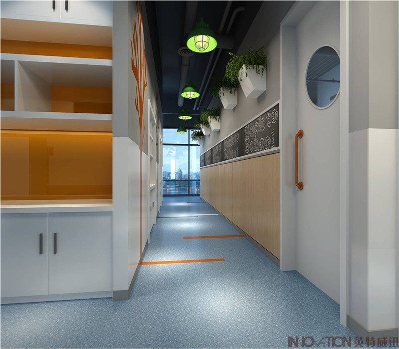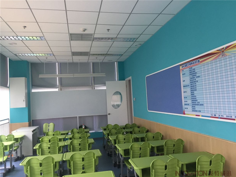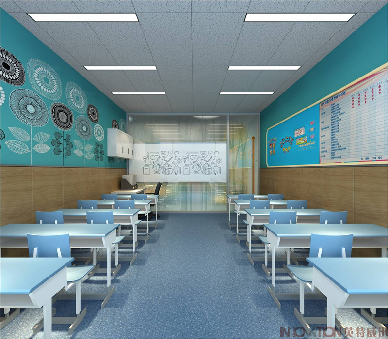 教室設(shè)計(jì)以藍(lán)色背景墻面為基礎(chǔ),和室內(nèi)課桌的藍(lán)色相呼應(yīng),給人一種藍(lán)色海洋的清爽感覺(jué)。墻面圖案樣式多樣,顏色豐富,突出圖案的多樣性和多變性。