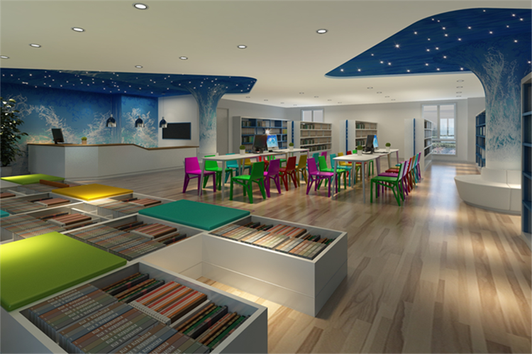 閱讀區和公共活動區以家庭式的溫馨風格為主,不使用座椅,代之以舒適便捷的懶人沙發,教師辦公區也被設計為一個可供多人討論交流的區域,同時又保障了教師的辦公需要。