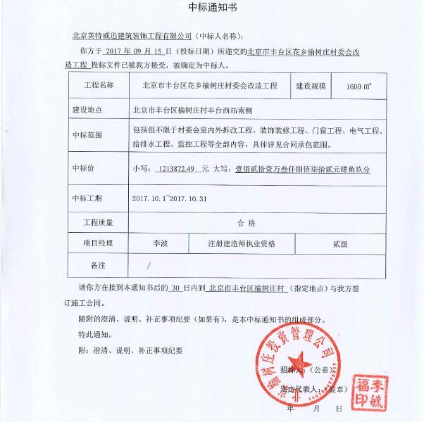 北京英特威迅建筑裝飾工程有限公司于2017年09月15日所遞交的北京市豐臺(tái)區(qū)花鄉(xiāng)榆樹(shù)莊村委會(huì)改造工程投標(biāo)文件已被我方接受,被確定為中標(biāo)人。
