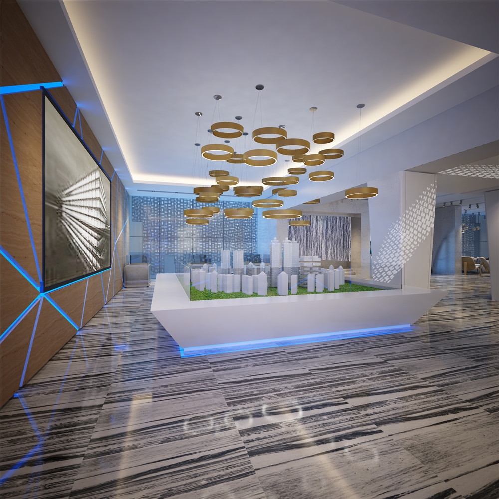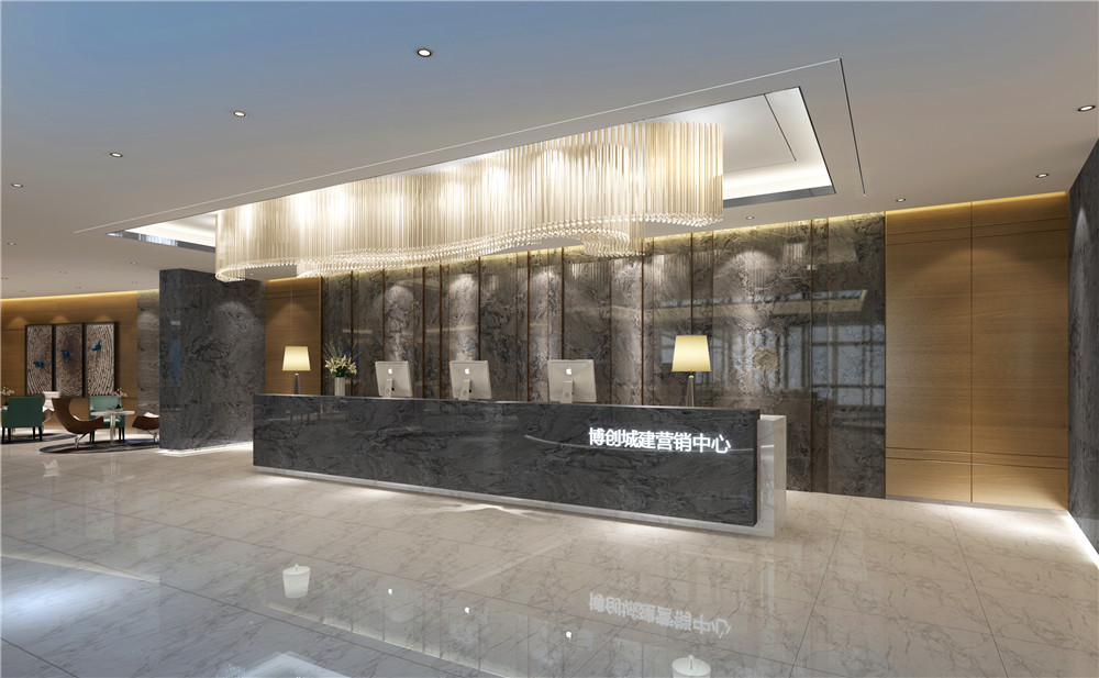 雍容虎歸的洽談接待區展現出一種高貴的氣息,顯得非常別具一格。在整個大廳的中央,擺放著一個橢圓形的樓盤景觀圖,可以非常方便的讓客戶看到樓盤附近的情況,體現出現代設計人性化的一面。