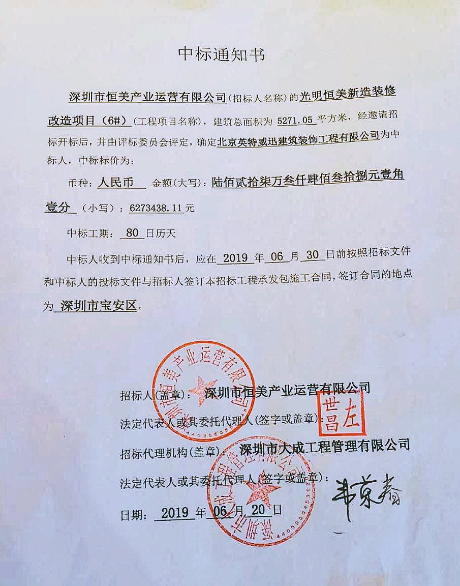 賀我公司中標深圳恒美產業運營有限公司的光明恒美新造裝修改造項目,該項目建筑面積為5271.05㎡,經邀請招標開標后,并由評標委員會評定,確定北京英特威迅建筑裝飾工程有限公司為中標人。