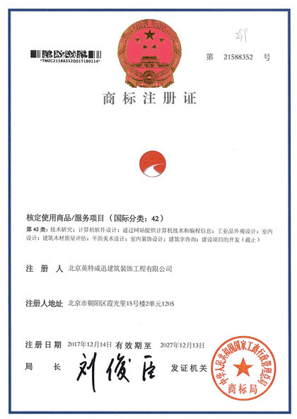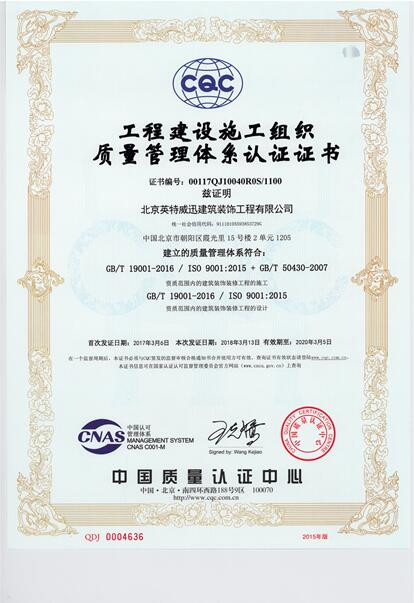 茲證明北京英特威迅建筑裝飾工程有限公司建立的質量管理體系符合資質范圍內的建筑裝飾裝修工程的施工和資質范圍內的建筑裝飾裝修工程的設計。