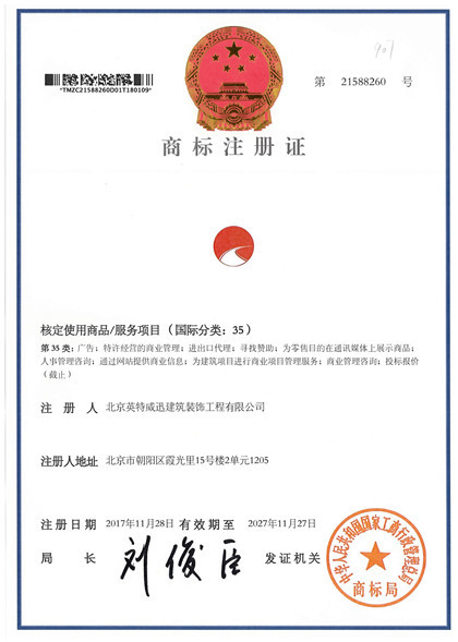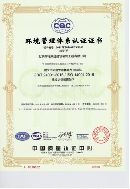 茲證明北京英特威迅建筑裝飾工程有限公司建立的環(huán)境管理體系符合標準,通過認證范圍如下:資質范圍內的建筑裝飾工程的設計、施工及其相關管理活動。
