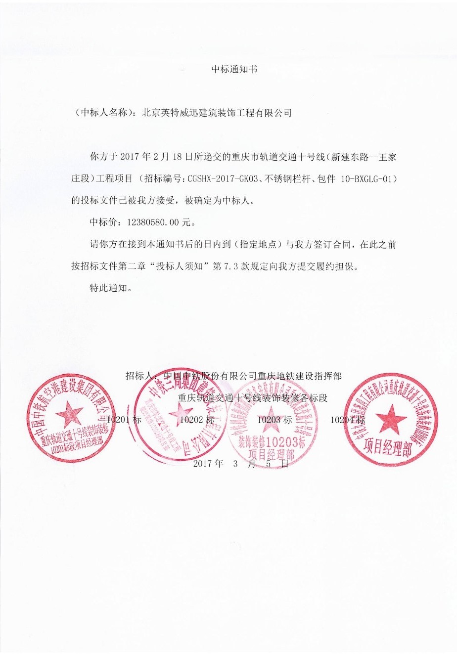 英特威迅公司成功中標《重慶市軌道交通十號線(新建東路--王家莊段)工程項目集中管控物資(不銹鋼欄桿、絕緣層)項目》,中標價格:12380580.00元。
